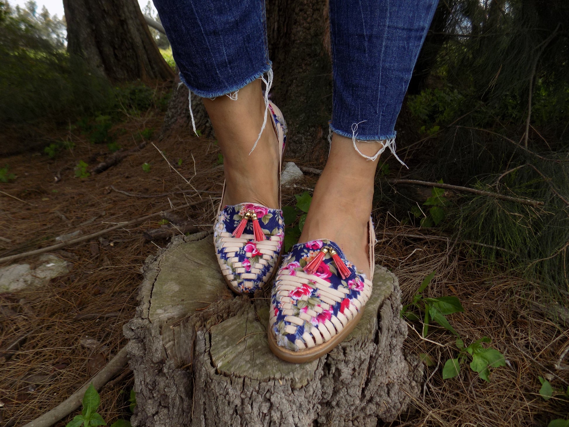 Totalmente piel, interior acolchonado, plantilla de vaqueta, tejido a mano acompañado de textil en decoración frontal. Suela de goma alto confort. Recomendado para todo tipo de pie.