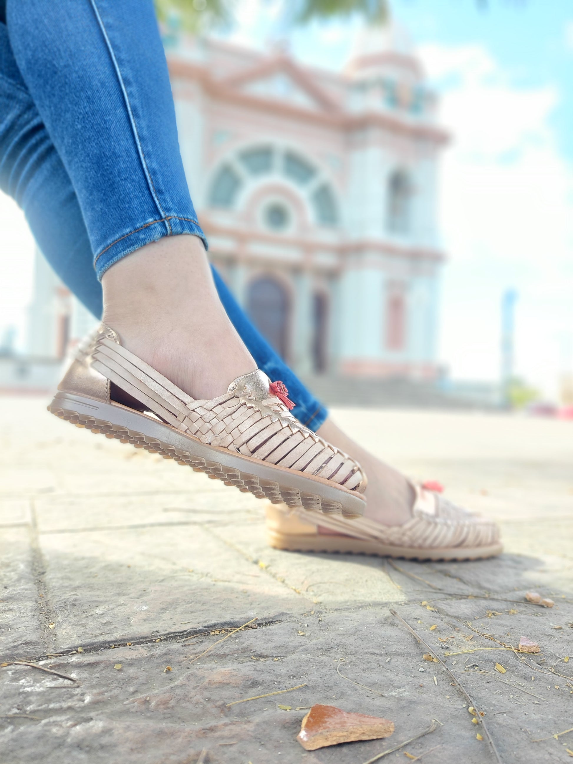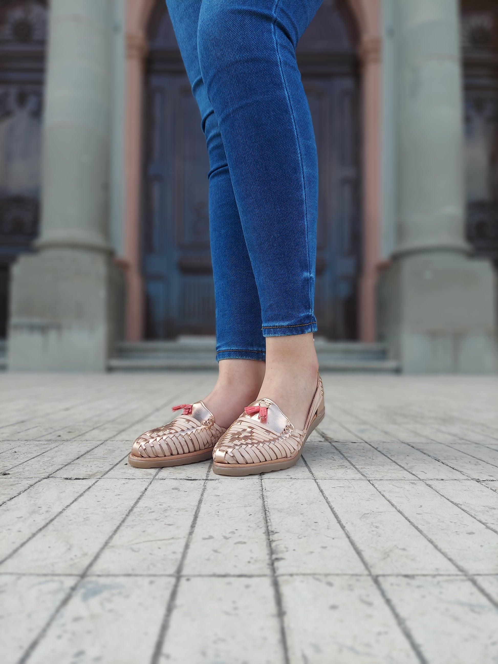 Totalmente piel, interior acolchonado, plantilla de vaqueta, tejido a mano acompañado de textil en decoración frontal. Suela de goma alto confort. Recomendado para todo tipo de pie.