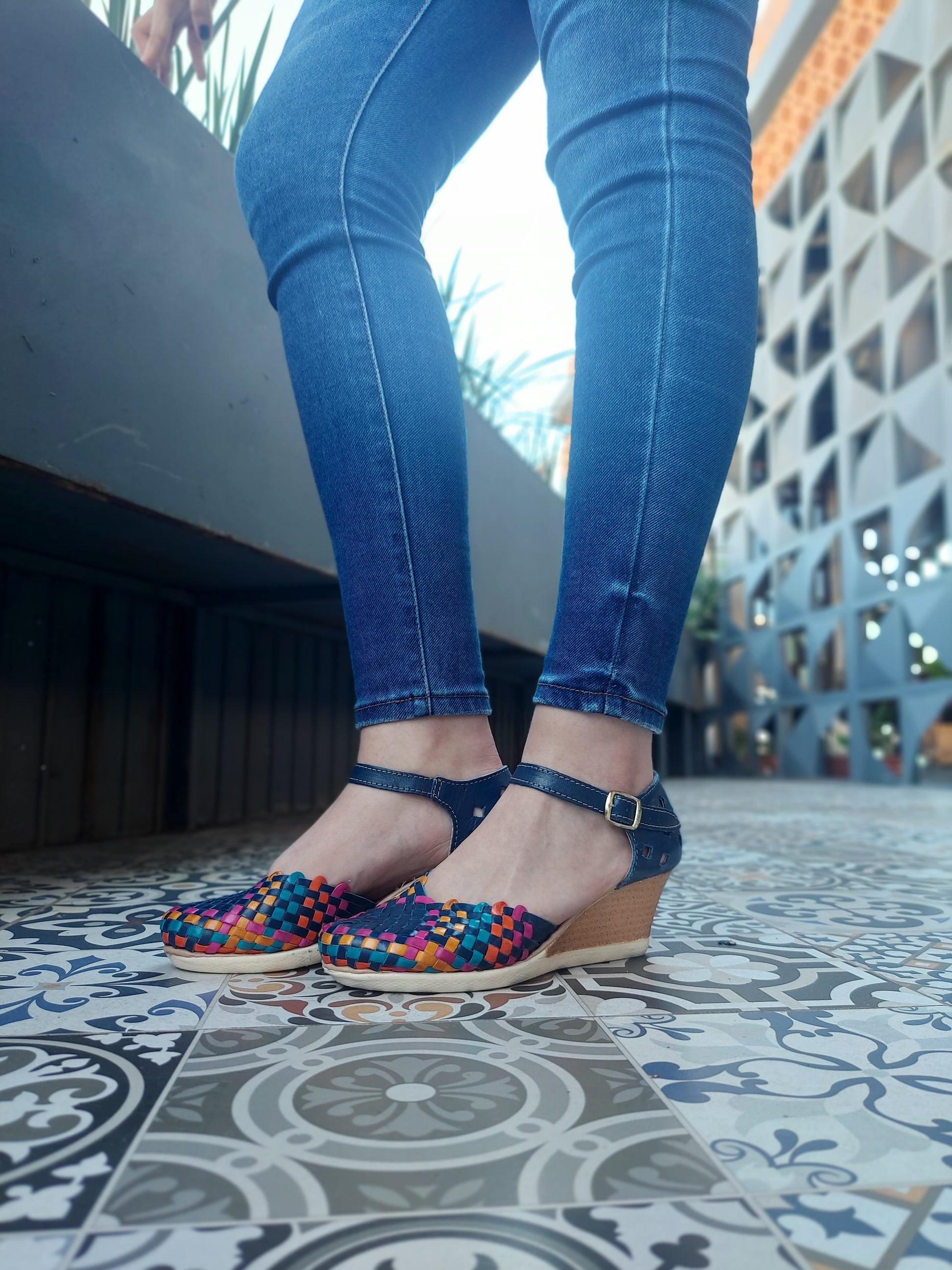 Plataforma corrida ultraligera de 6 cm, plantilla de piel alcholchonada, suela antiderrapante, hebilla ajustable, y trabajo del calzado en 100% piel trenzado a mano.