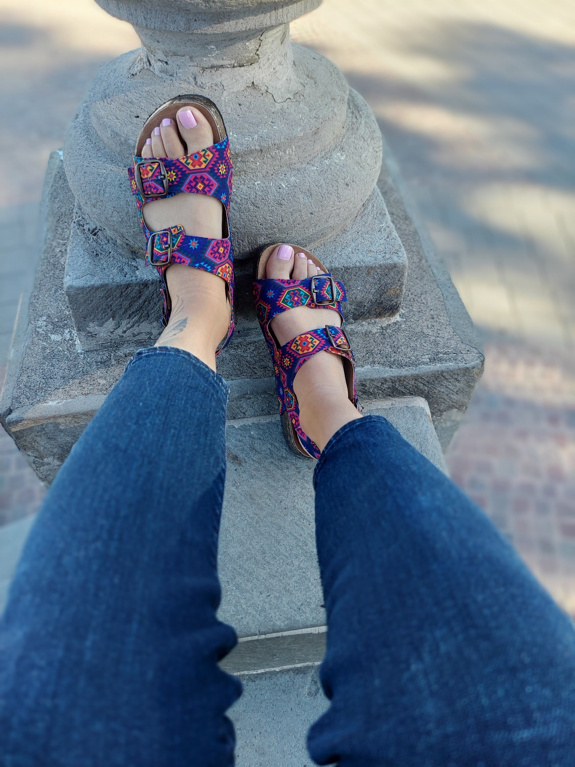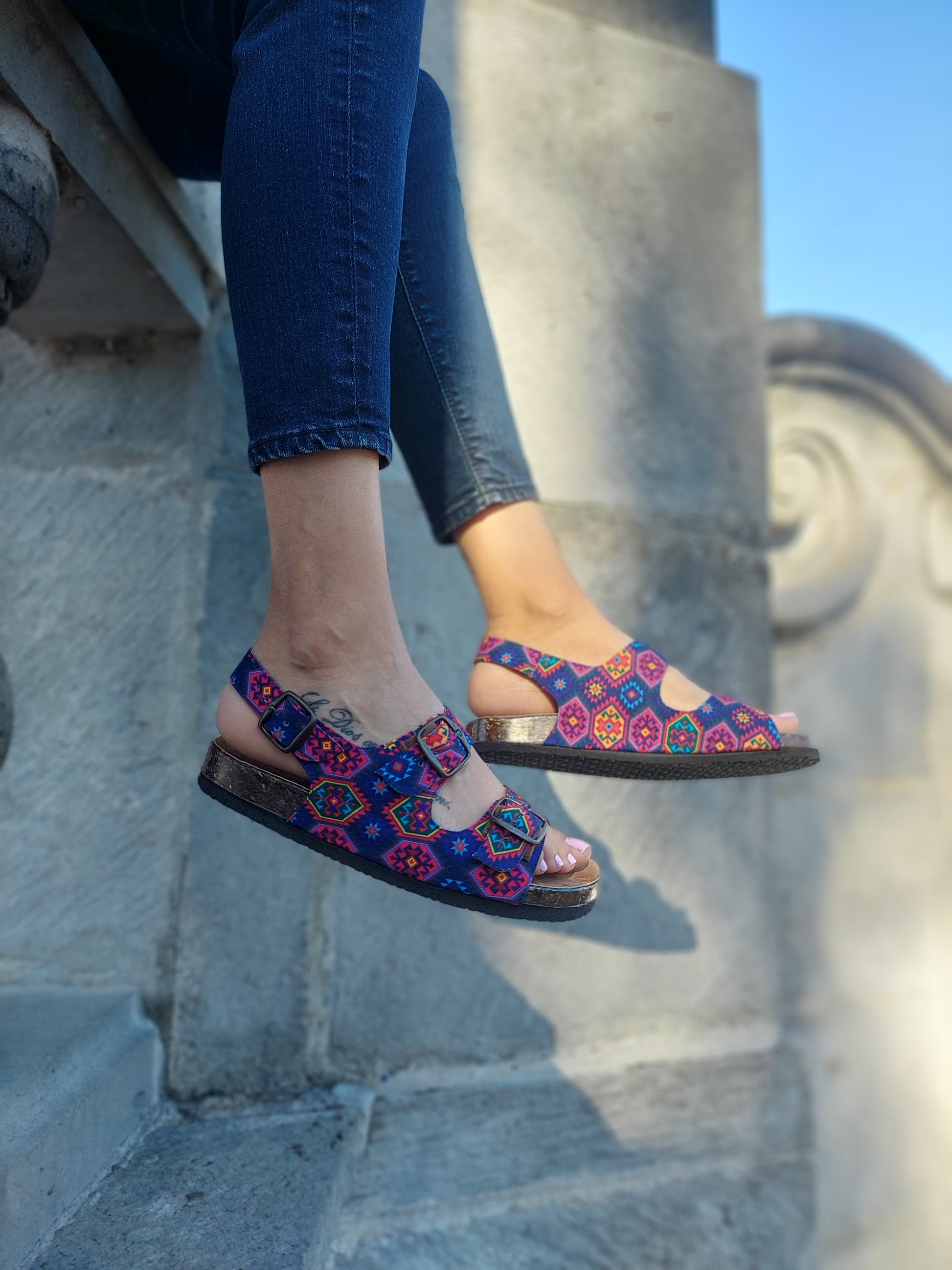 Son eleboradas en 100% piel, con un recubrimiento o estampado para un diseño y textura muy mexicana, a base de un textil hecho en México con materiales reciclados, el interior de la sandalia es totalmente piel. Plantilla de caucho para alto confort, y suela de materiales suaves y ligeros para reducir el impacto, traen ajustador de talla (ancho).
