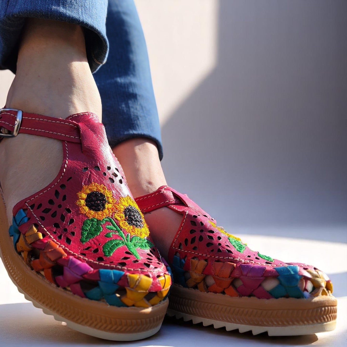 Luce un estilo único con este huarache artesanal en tono miel, elaborado con grabado floral en la parte frontal y un hermoso detalle tejido en colores vivos alrededor de la punta. Su diseño cerrado con correa y hebilla ajustable asegura un calce cómodo y firme.