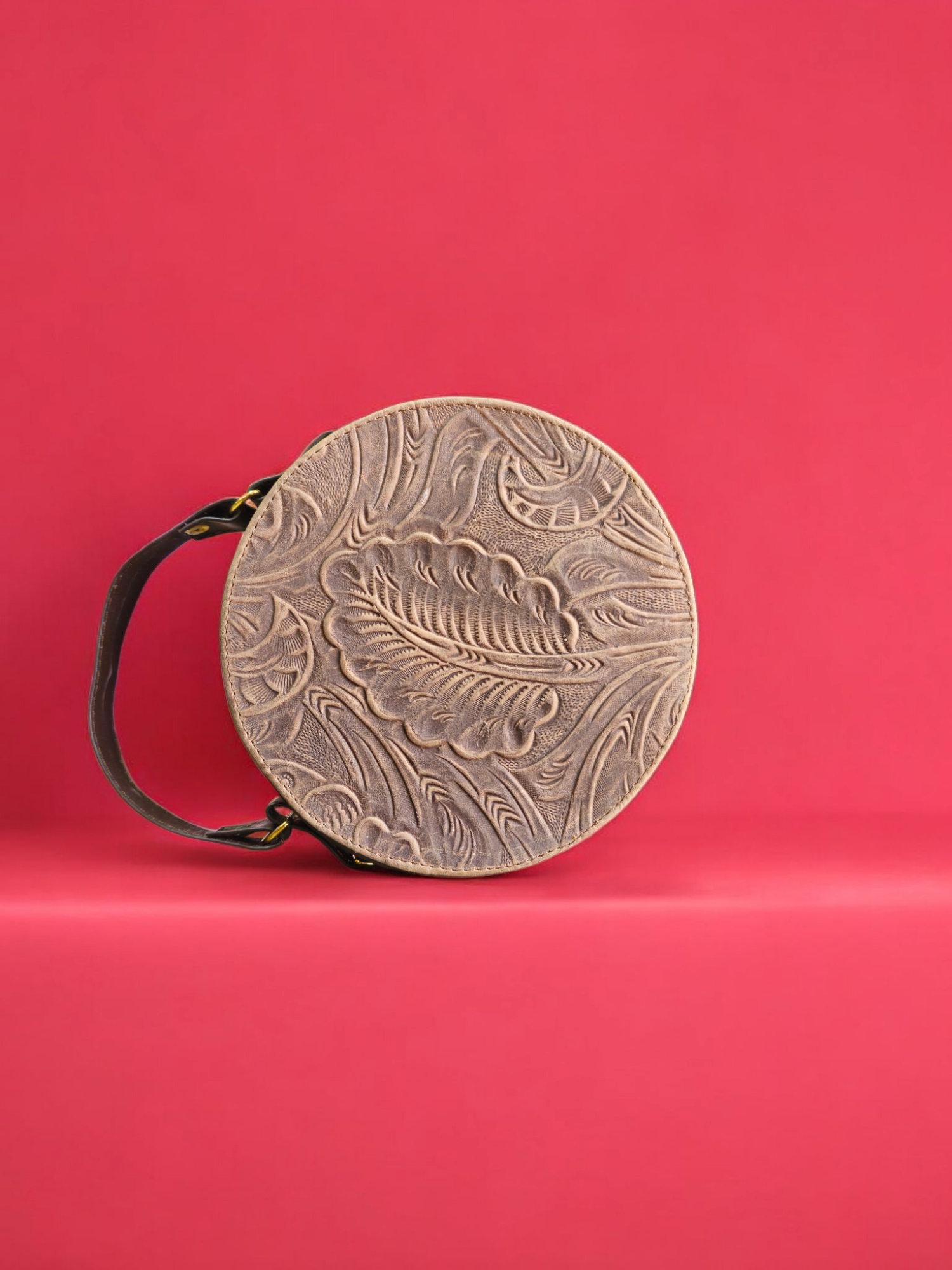 Encantadora bolsa redonda de piel, destacada por su singular forma circular y un exquisito diseño floral repujado. Este accesorio distintivo es ideal para quienes buscan añadir un toque de originalidad y elegancia artesanal a su estilo. Su confección en piel garantiza no solo una estética inigualable, sino también una resistencia y un acabado que perdurarán por años.
