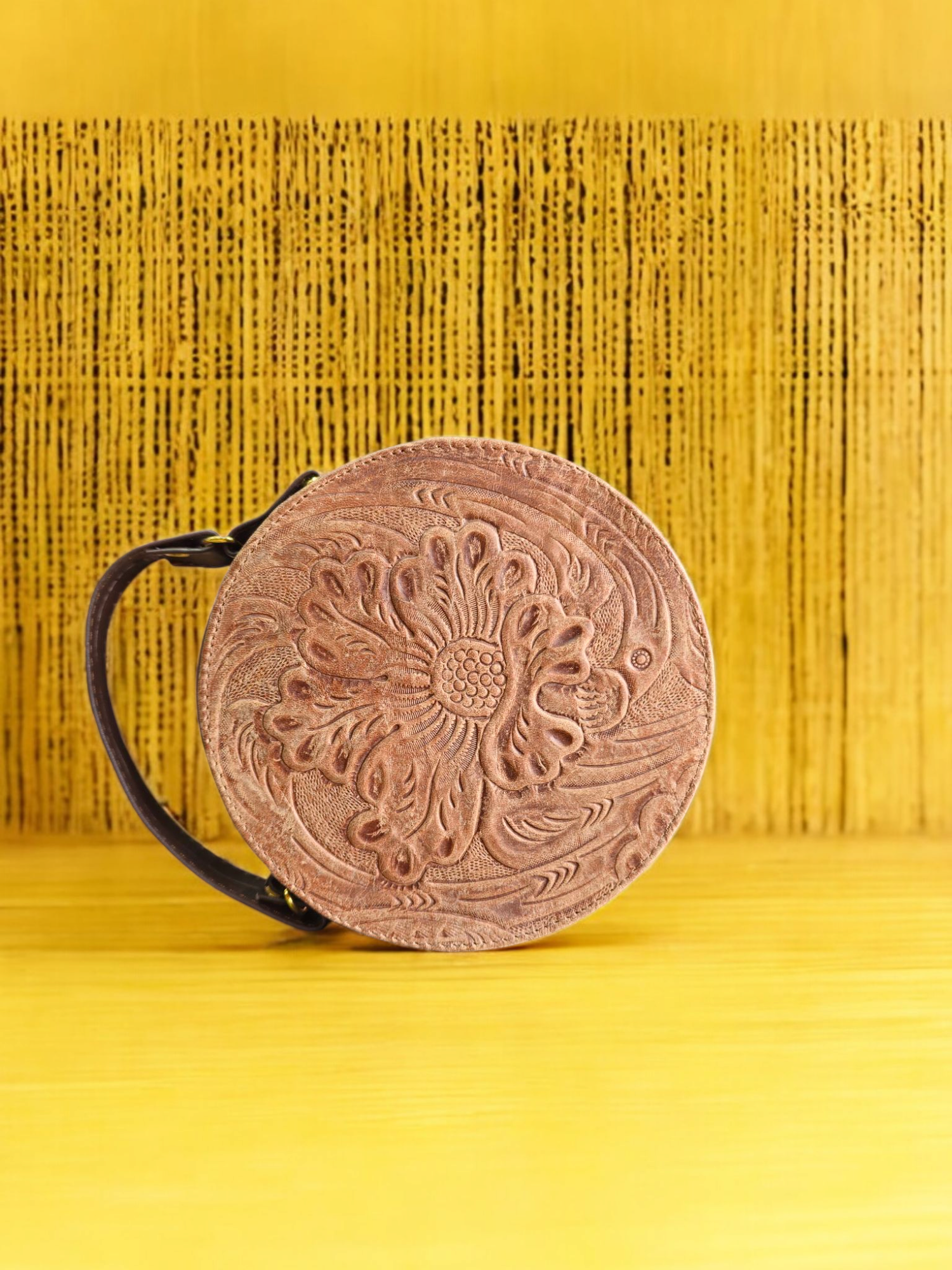 Encantadora bolsa redonda de piel, destacada por su singular forma circular y un exquisito diseño floral repujado. Este accesorio distintivo es ideal para quienes buscan añadir un toque de originalidad y elegancia artesanal a su estilo. Su confección en piel garantiza no solo una estética inigualable, sino también una resistencia y un acabado que perdurarán por años.