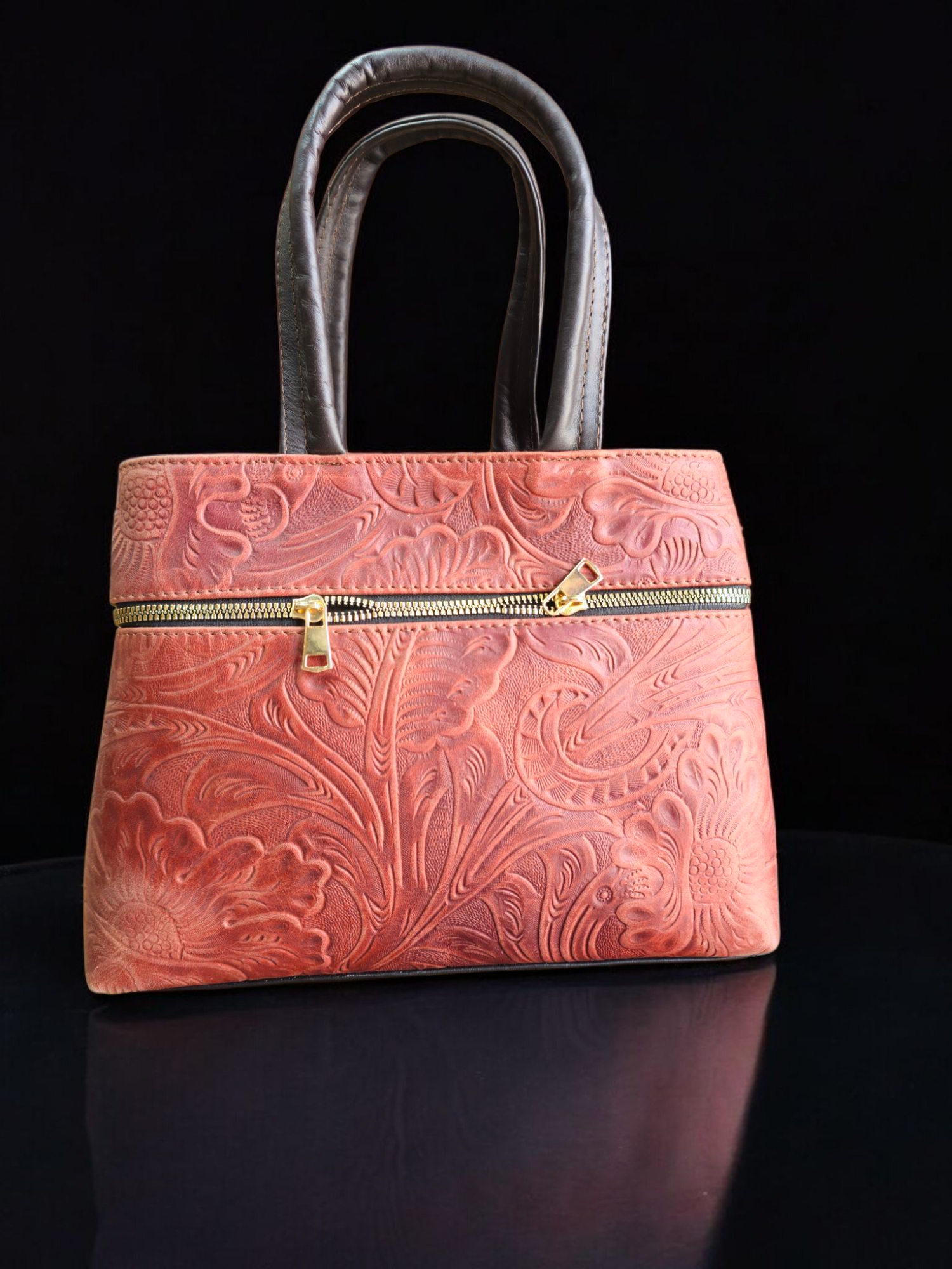 Descubre la elegancia artesanal con esta bolsa de piel grabada, cuidadosamente diseñada con un patrón floral que resalta su carácter único y atemporal. Ideal para el día a día o eventos especiales, su tono rojizo con acabado rústico la convierte en una pieza que roba miradas.
