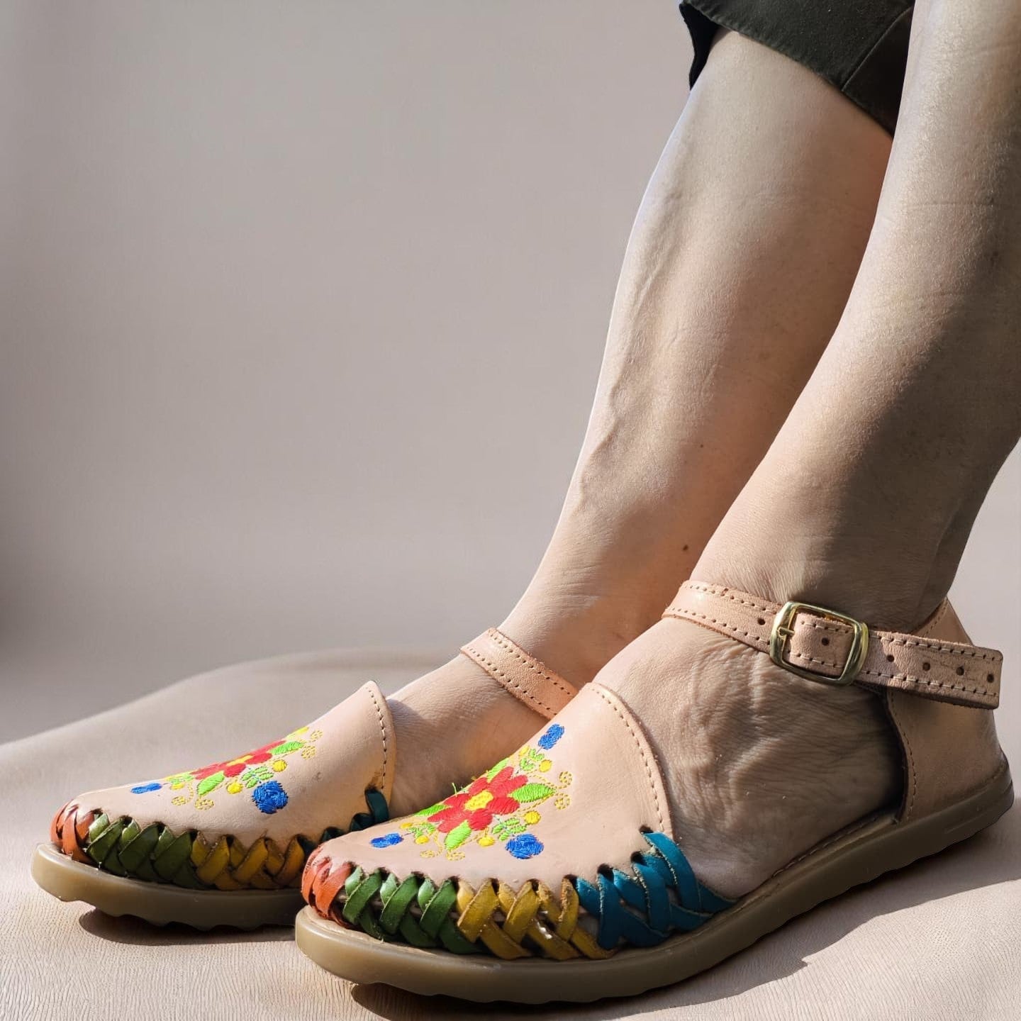 Dale vida a tus pasos con unos huaraches artesanales de piel. Cada par es una explosión de creatividad, elaborado a mano por artesanos mexicanos que combinan tradición con un toque moderno y femenino.
